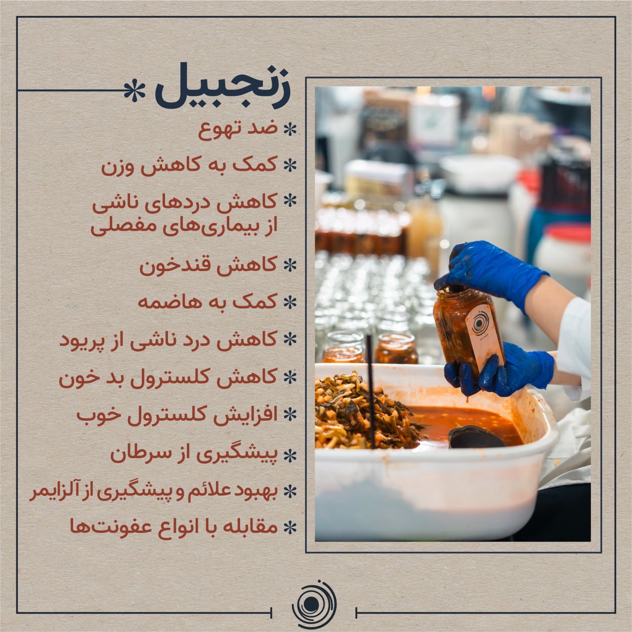 یکی دیگر از مواد استفاده شده در کیمچی زن، زنجبیل است. برای زنجبیل خواص بسیاری در مقالات آمده است. در ادامه سعی می کنیم به صورت مختصر، بعضی از این خواص را، بر اساس مقالات چاپ شده در ژورنالهای معتبر علمی برشمریم.