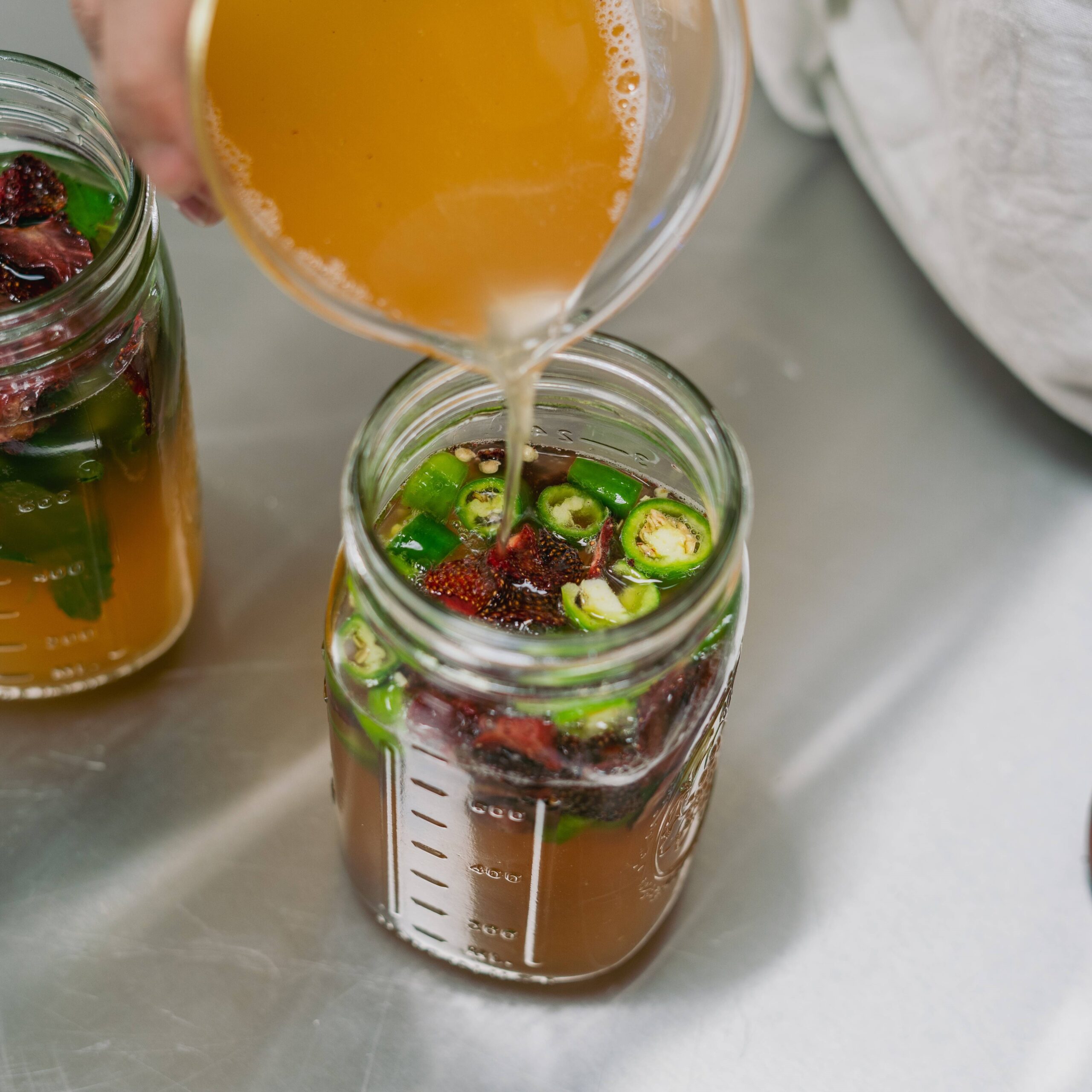 این نوشیدنی حاصل ترکیب کامبوجا لمون گرس، توت فرنگي تازه، فلفل هالوپينو، صبر، زمان و عشق است.